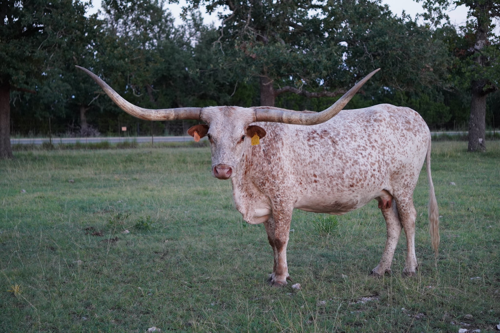 We purchased her from KDK Longhorns in fall of 2023. She is a very tall, stout cow out of the 90'' DML Sharita. Her red roan coloring is highly sought after, and she typically passes that coloring on to her offspring. Her "old school" pedigree should pair well with some new school bulls!